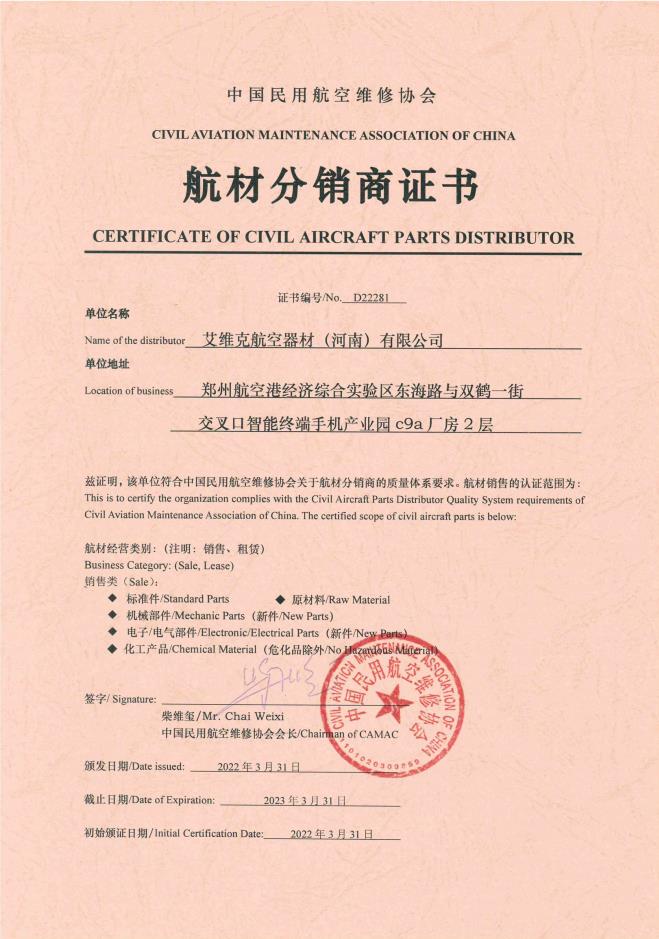 AVC Parts Supply (HeNan) Co., Ltd. obtained the certificate of distributor of aviation materials
