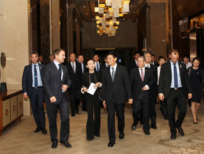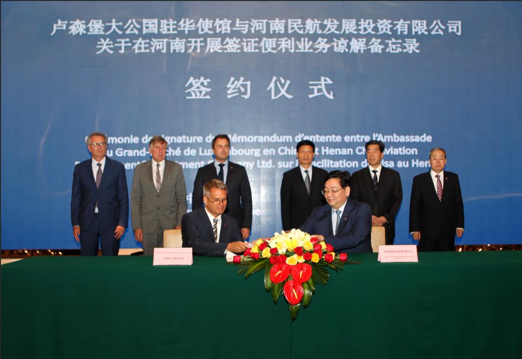 6月13日,省委书记、省人大常委会主任谢伏瞻在郑州会见了来豫访问的卢森堡首相格扎维埃•贝泰尔一行,并和省长陈润儿共同见证有关合作协议的签署。河南航投党委书记、董事长张明超一同参加会见,并代表河南航投与卢森堡驻华大使石泰嵋签署《关于在河南开展签证便利业务谅解备忘录》.