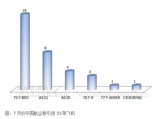 根据民航数据分析系统CADAS,2016年7月份中国大陆航空公司新引进飞机33架。其中南航引进飞机数量最多,为6架;机型方面,737-800飞机数量最多,为16架。
