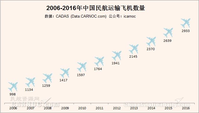 民航资源网2017年1月6日消息:根据CADAS民航数据分析系统,至2016年底,中国民航运输飞机机队数量(不含港、澳、台)达到了2933架, 全年共引进飞机369架,其中12月份新引进飞机36架。