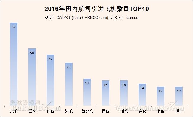 在航空公司中,东航引进的飞机最多,为52架,国航36架、南航32架。