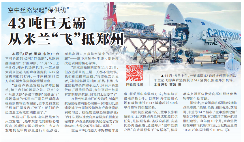 “感谢卢森堡货航及时伸出援手,解了我们的燃眉之急。郑卢‘空中丝绸之路’是条可贵的‘保供线’!”现场等待的邹县电厂副总经理蒋志强看到货物近在眼前,迫不及待拿起手机向厂里报告:“到了!咱们的升级改造工程能如期推进了。”