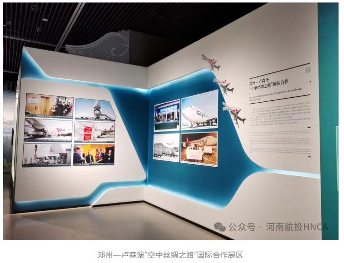 这一主题展板上,精选了10张图片记录豫卢共建“空中丝路”的关键事件。既有2014年河南航投与卢森堡货航在郑州签署股权合作协议、“郑州号”巨无霸货机首次抵郑的起始节点;也有这条丝路承运河南省向卢方捐赠的抗疫物资、郑卢直飞客航首批旅客抵达的温暖瞬间;还有卢森堡货航在郑州加注可持续航空燃料、郑卢航线货运量突破100万吨的喜庆时刻,精彩讲述豫卢双方在“一带一路”框架下相融互促,从硬联通、软联通到心联通的生动实践。