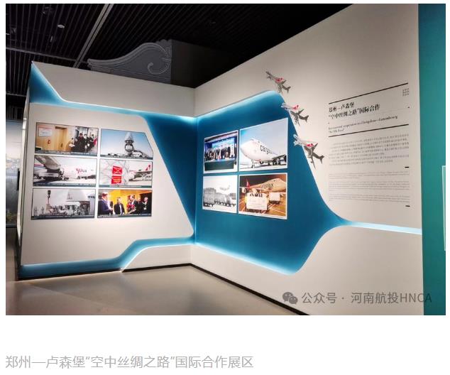 这一主题展板上,精选了10张图片记录豫卢共建“空中丝路”的关键事件。既有2014年河南航投与卢森堡货航在郑州签署股权合作协议、“郑州号”巨无霸货机首次抵郑的起始节点;也有这条丝路承运河南省向卢方捐赠的抗疫物资、郑卢直飞客航首批旅客抵达的温暖瞬间;还有卢森堡货航在郑州加注可持续航空燃料、郑卢航线货运量突破100万吨的喜庆时刻,精彩讲述豫卢双方在“一带一路”框架下相融互促,从硬联通、软联通到心联通的生动实践。